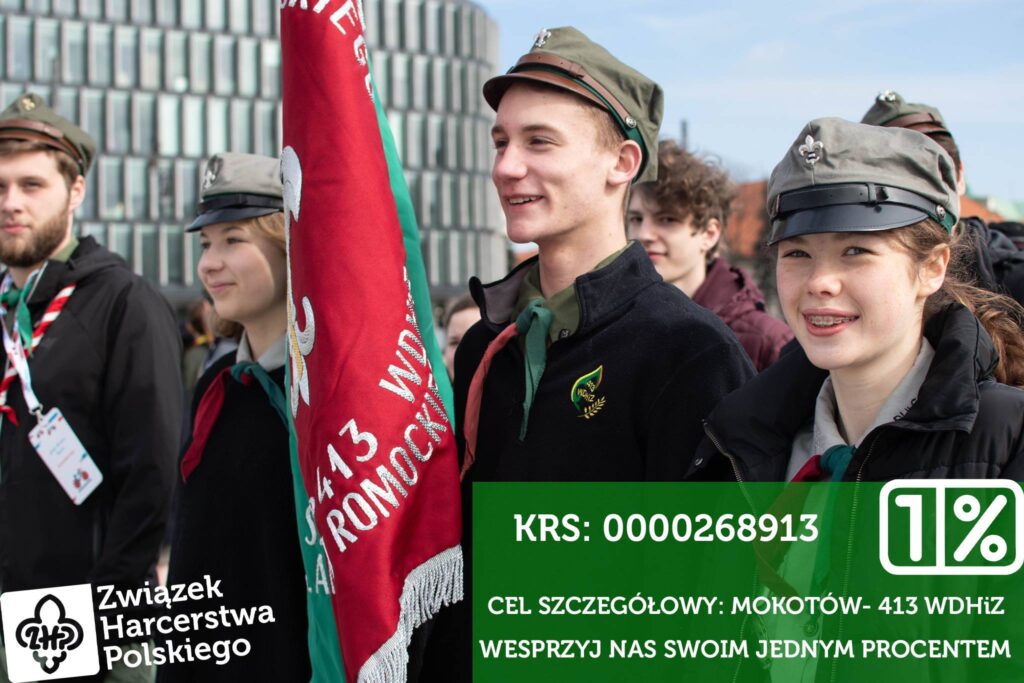 Szczep 413 WDHiZ jest jednostką Chorągwi Stołecznej ZHP, dlatego w odpowiedniej rubryce należy podać nr KRS Chorągwi (0000268913), a w miejscu przeznaczonym na doprecyzowanie odbiorcy wpisać „MOKOTÓW- 413 WDHiZ”.